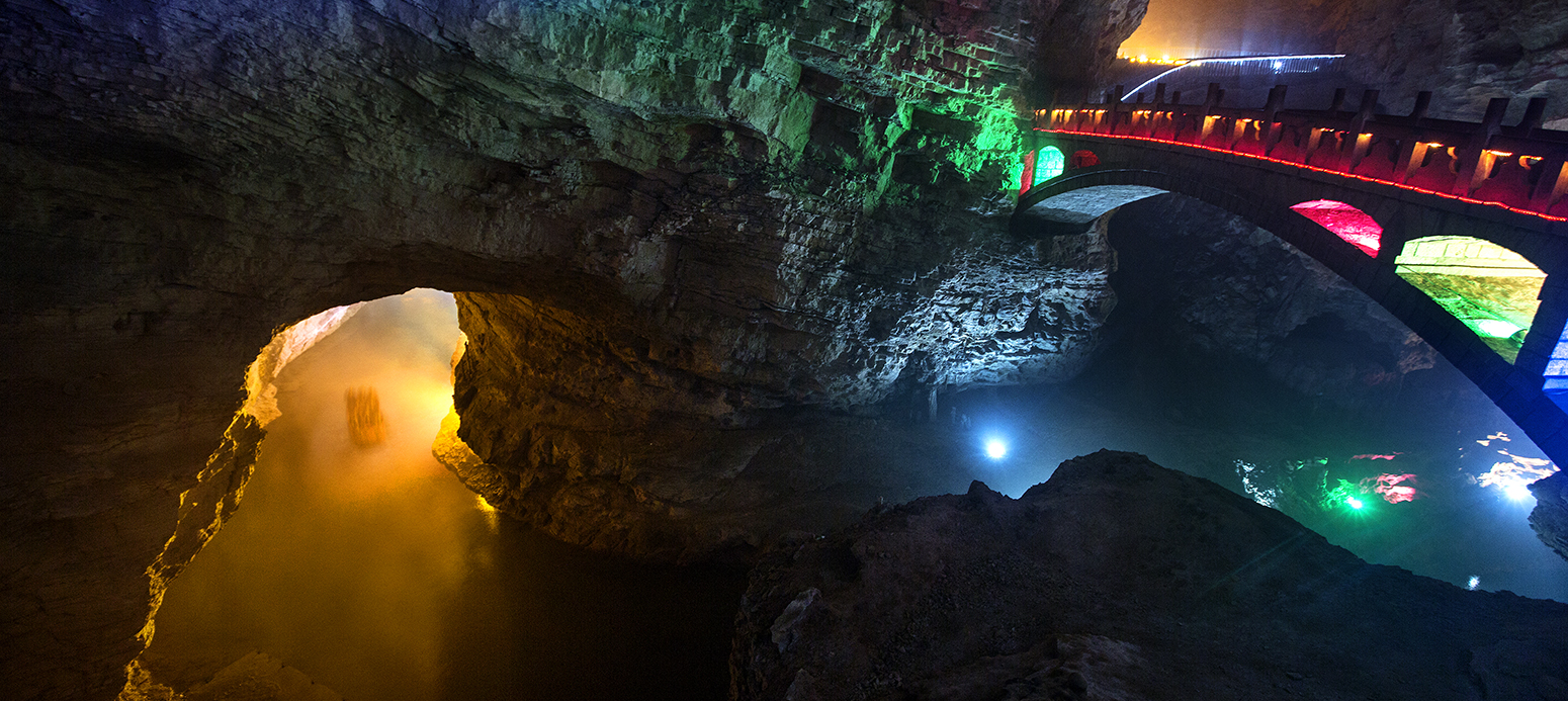 黃龍洞,一座形成于3.8億年前的大自然的迷宮,高闊的洞天,幽深的暗河,懸空的瀑布,密集的鐘乳石,匯聚成氣勢(shì)雄偉的洞穴大觀。目前,黃龍洞已探明的洞底總面積是10萬平方米,全長(zhǎng)7.5公里,垂直高度140米,內(nèi)分兩層旱洞和兩層水洞。