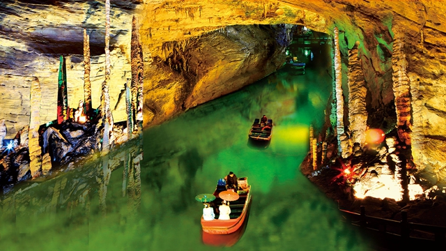 黃龍洞因相傳古代洞內(nèi)有黃龍藏身而得名,1983年經(jīng)當(dāng)?shù)?個(gè)青年民兵發(fā)現(xiàn)探明,1984 年正式對(duì)外開(kāi)放。因洞內(nèi)擁有高闊的洞天、幽深的暗河、懸空的瀑布、上千個(gè)白玉池、數(shù)萬(wàn)根石筍。
